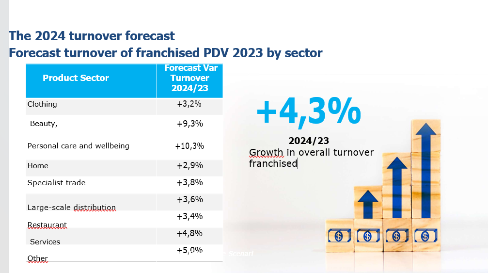 Franchising in Italy continues to show a growth trend, with a turnover increase of 9.9%, approaching 34 billion euros. The number of franchising points of sale has also grown during 2023, with a greater acceleration compared to the trend recorded in the past (7.6% against 2.2%). Likewise, the total number of franchised sales points grows, reaching 65,806 (+4,664 units) and the number of employees, which with 34,919 more units, stands at a total of 287,767. During 2024, a growth of +4,3% is expected in the total turnover in the Italian franchising sector.