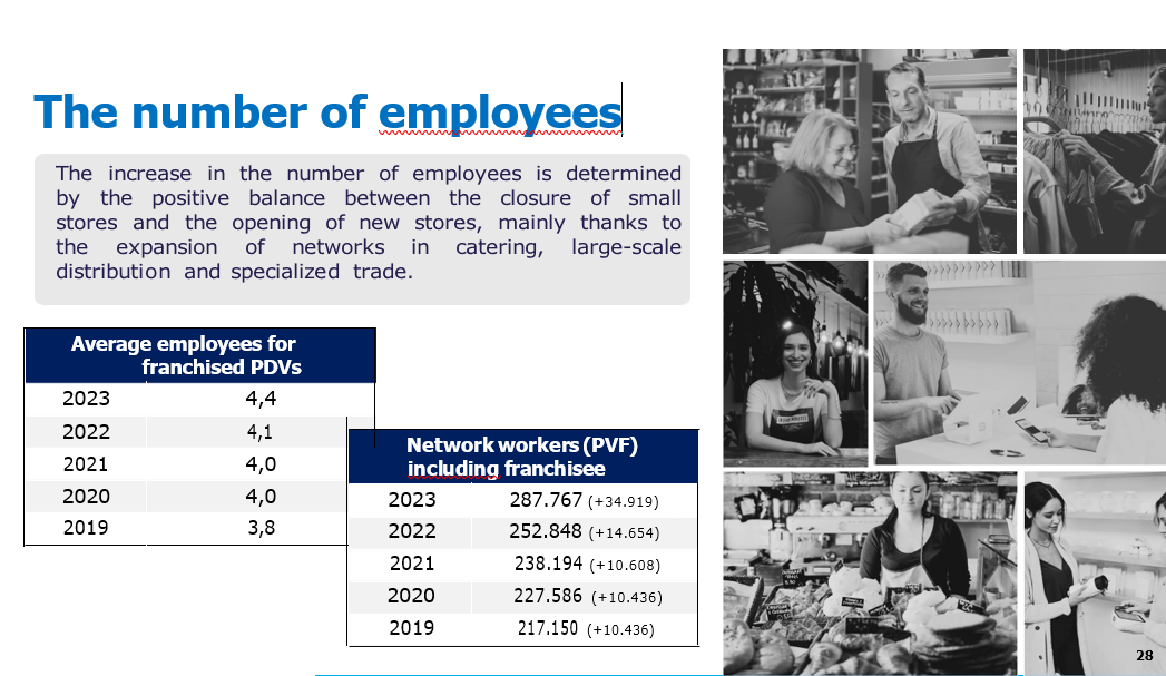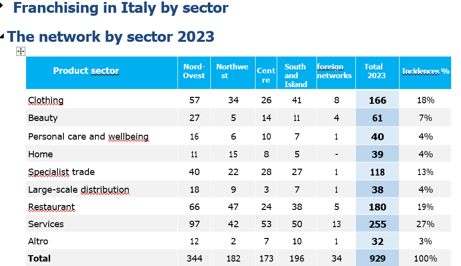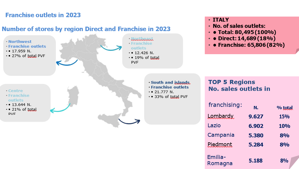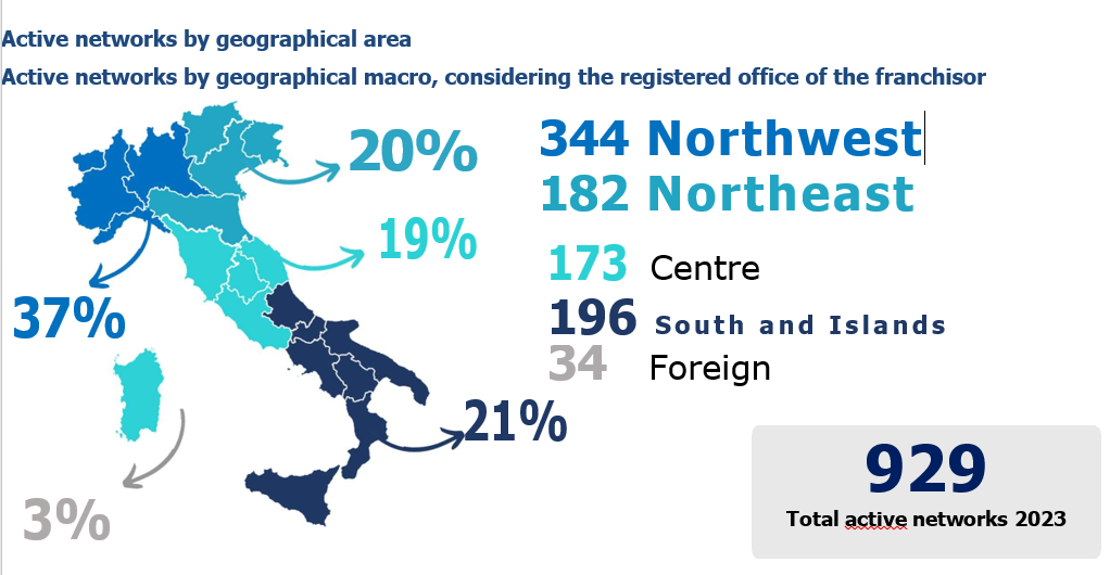 Franchising confirms to be an excellent business accelerator in Italy, provided that there is management efficiency. Affiliation with a franchisor is therefore consolidated as a solution capable of offering rapid strategic positioning and reducing risks and uncertainties. This model remains a strategic choice to enter Italian market with a solid basis, reducing overall risk.